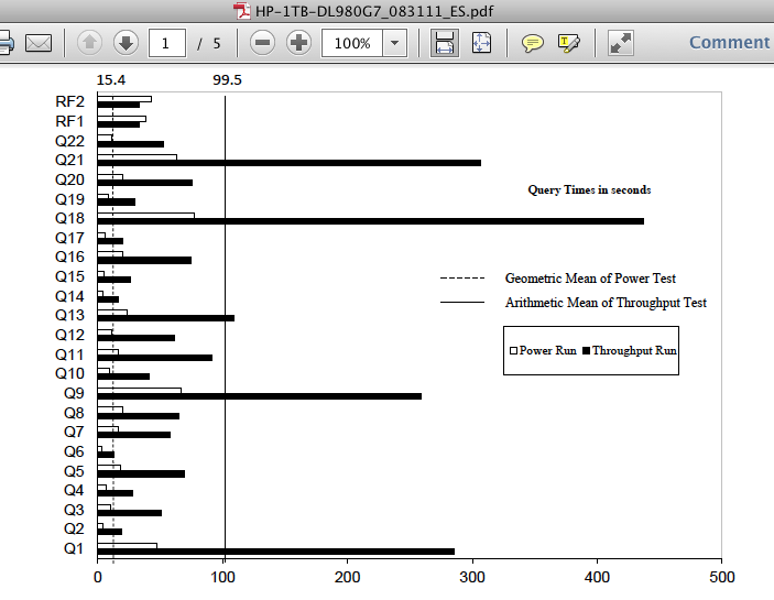 The thing that confuses me is the 1TB HP Intel Oracle RAC result has such a strong geometric mean for the Power Run (4.6s) but the 1TB DL980G7 SQL Server result has such a poor geometric mean fo the power run (58.3s). I suspect this is what you were talking about when saying its a mistake to compare SQL Server results to Oracle based results?