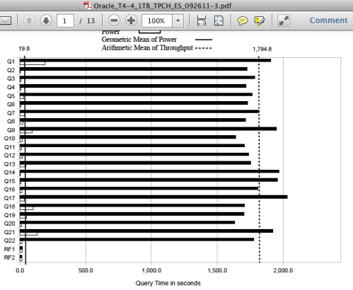 Shortly after this 3TB result went public I got an email from a reader wondering if I intended to blog about the fact that Oracle did not use Exadata in this benchmark. I replied that I am not going to blog that point because while TPC-H is an interesting workload it is not a proper DW/BI workload. I’ve blogged about that fact many times in the past. The lack of Exadata TPC benchmarks is in itself a non-story.