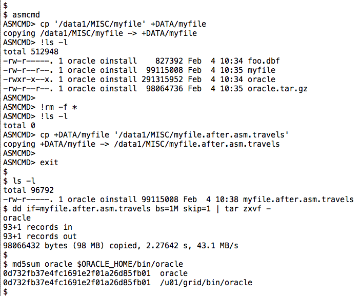 The cp sub-command of ASM lets you stuff certain database files into ASM. We all know this. However, just to make it all fresh in people’s minds I’ll show a screen shot of me trying to push a compressed tar archive of $ORACLE_HOME/bin/oracle up into ASM: