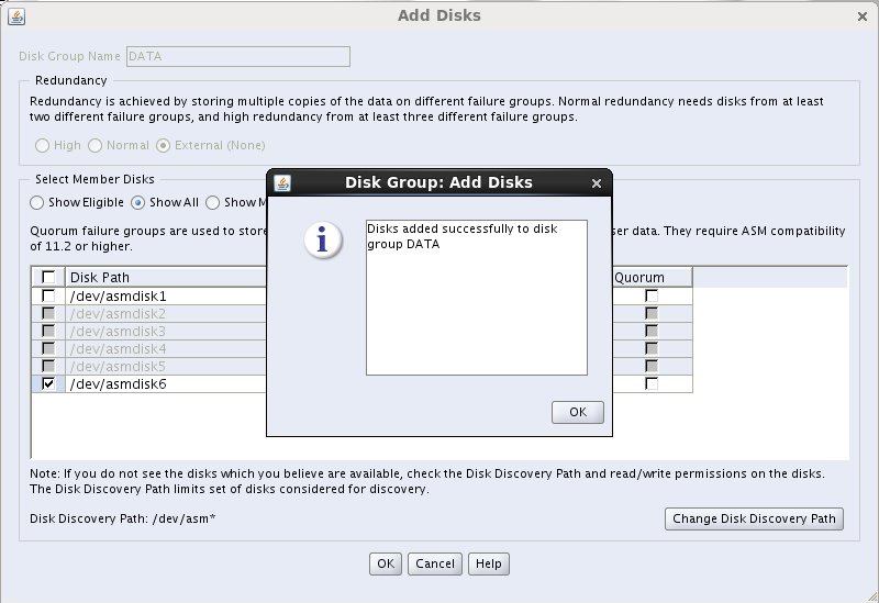 The next task was to use ASMCA (ASM Configuration Assistant) to add the XtremIO volume to the ASM disk group called “DATA”:
