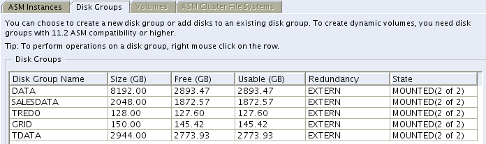 Figure 1 shows a screen capture of ASMCA reporting that all disk groups are mounting on both nodes of the RAC cluster and that the SALESDATA disk group has 2TB capacity at the beginning of the testing.