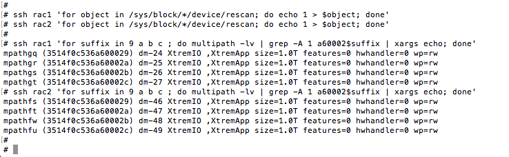 Figure 3 shows the simple commands the administrator needs to execute to rescan for block device changes on all nodes of the RAC cluster. Figure 3 also shows the commands necessary to verify that the block device reflects the new capacity given to each of the LUNs that map to the XtremIO volumes.