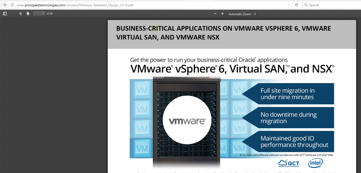 The following is a link to a Principled Technologies publication. This whitepaper is co-branded by Intel and Quanta Cloud Technologies. The paper proves platform suitability of VMware/Quanta Cloud Technologies and Intel processors for Oracle I/O intensive workloads with SLOB results: