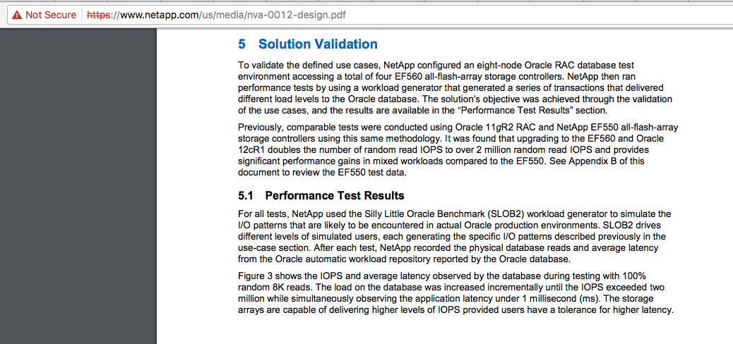 Kudos to NetApp for sharing platform performance proof points with a freely available, understandable and believable Oracle Database I/O testing toolkit–SLOB. The paper can be downloaded here.