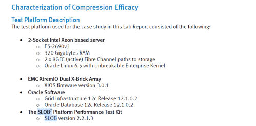 EMC Using SLOB to characterize combining XtremIO array-level compression in combination with Oracle Advanced Compression Option: https://community.emc.com/servlet/JiveServlet/download/38-110350/aco-xio-lab-report-2015.04.27-1.pdf :