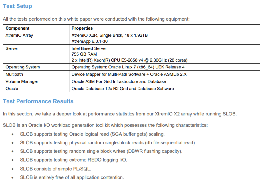 - EMC Documenting XtremIO X2 Best Practices with SLOB testing: https://www.dellemc.com/resources/en-us/asset/white-papers/products/storage/White_Paper_Best_Practices_for_Running_Oracle_on_XtremIO_X2_H16919.pdf