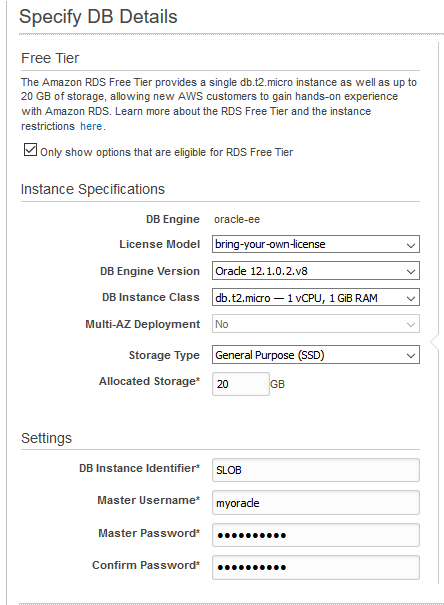 This is a simple 9-step, step-by-step guide for installing, loading and testing a basic SLOB deployment on a local server with connectivity to an instance of Amazon RDS for Oracle in Amazon Web Services. To show how simple SLOB deployment and usage is, even in a DBaaS scenario, I chose to base this guide on a t2.micro instance. The t2.micro instance type is eligible for free-tier usage.