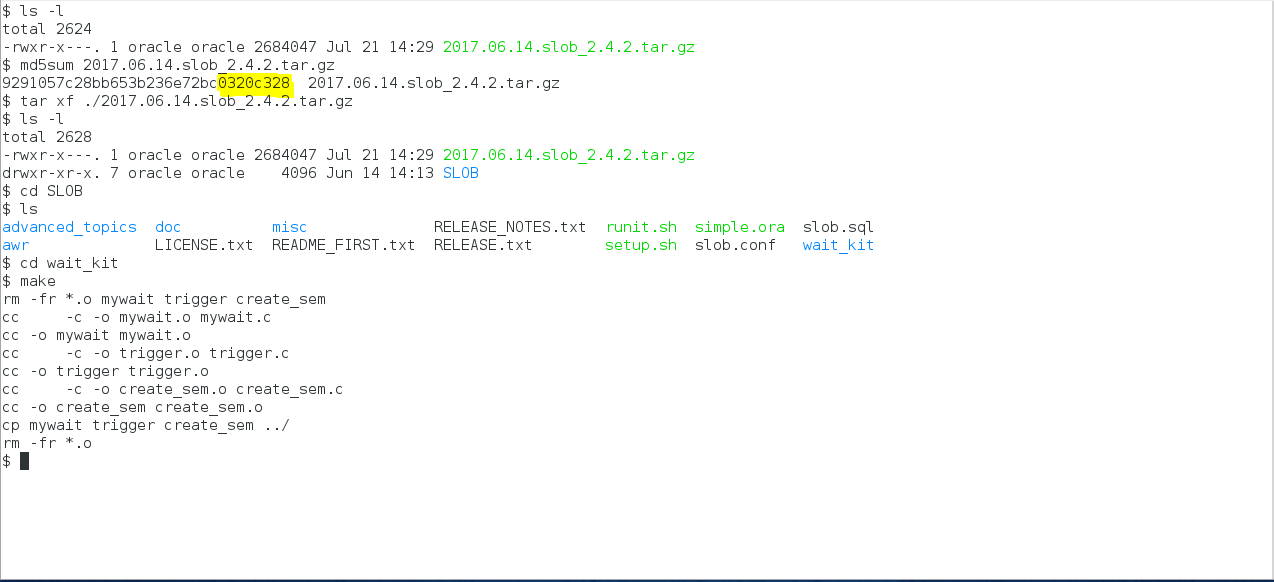 Obtain the SLOB distribution file from the SLOB Resources Page. Please note the usage of the md5sum(1) (see Figure 3) command to verify the contents are correct before performing the tar archive extraction. You’ll notice the SLOB Resources Page cites the check sums as a way to ensure there is no corruption during downloading.