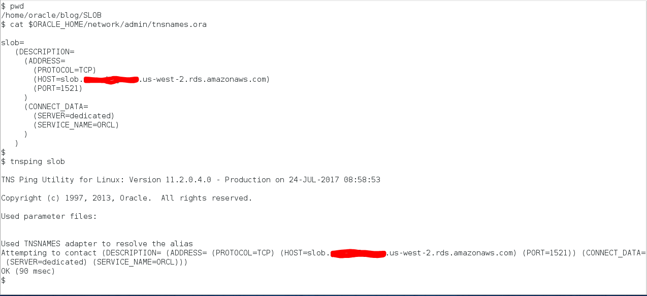 Figure 4 shows how to construct a SQL*Net service that will offer connectivity to your Amazon RDS for Oracle instance. The HOST assignment is the Amazon RDS for Oracle endpoint which can be seen in the instance details portion of the RDS page in the AWS Console. After configuring SQL*Net it is good to test the connectivity with the tnsping command–also seen in Figure 4.