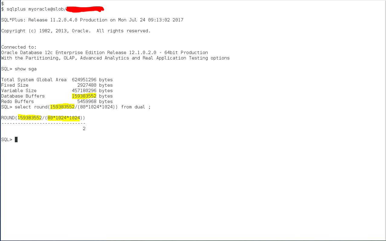 Once you know the size of your SGA database buffer pool you will be able to calculate the minimum number of SLOB schemas that need to be loaded. Please note, SLOB supports two schema models as described in the SLOB documentation. The model I’ve chosen for this example is the Multiple Schema Model. By default, the slob.conf file has a very small SCALE setting (80MB). As such, each SLOB schema is loaded with a table that is 80MB in size. There is a small about of index overhead as well.