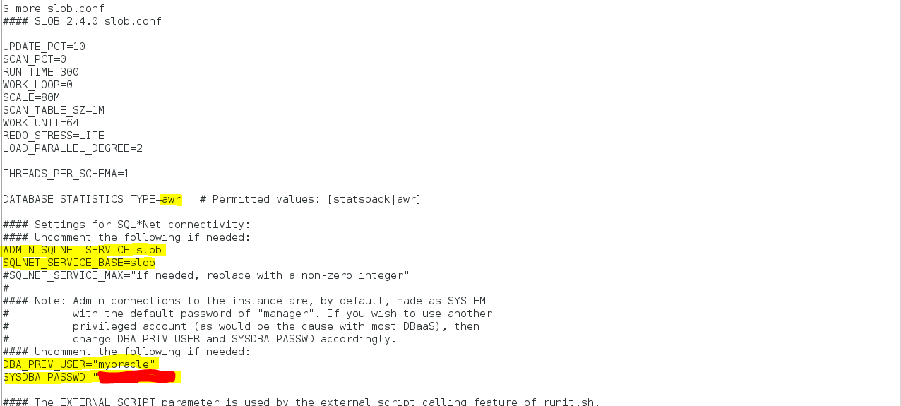 The bottom two parameters are Amazon RDS for Oracle connectivity settings. The DBA_PRIV_USER parameter in slob.conf maps to the master user of your Amazon RDS for Oracle instance. The SYSDBA_PASSWD parameter needs to be set to your Amazon RDS for Oracle master user password.
