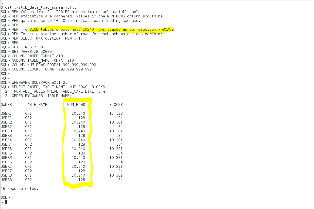 After the setup.sh script exits, it is good practice to view the output file as per setup.sh command output. Figure 9 shows that SLOB expected to load 10,240 blocks of table data in each SLOB schema and that this was, indeed, the amount loaded (highlighted in yellow).