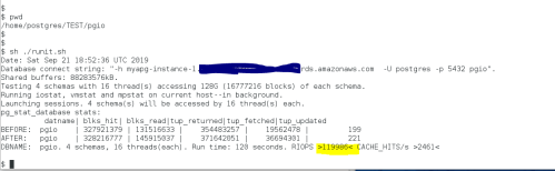 As shown in Figure 3, pgio saves the output of /proc/diskstats. The most accurate way to calculate physical accesses to storage by pgio is to calculate the delta between the before and after data in the pgio_diskstats.out file. The diskstats data shows that the true physical read IOPS rate was 301,599 not the 436,964 figure reported by runit.sh. Again, this is because runit.sh reports reads, not physical reads and that is because PostgreSQL doesn’t really know whether a read operation is satisfied with a page cache buffer hit or a physical access to the storage device. Also shown in Figure 3 is how the data in iostat.out and diskstats output are within .1%.