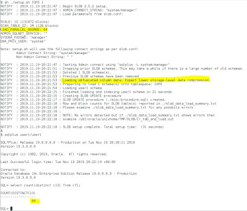 The output in Figure 1 shows how I set up a 48-schema (32GB each) test with a single pgio thread accessing each schema. The output of runit.sh shows that the PostgreSQL primary cache (shared memory) is 4GB and that at the end of the 120 second test the internal PostgreSQL counters tallied up 436,964 reads from storage per second (RIOPS).